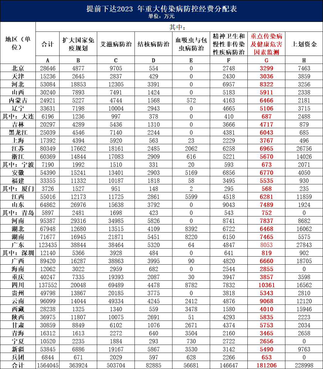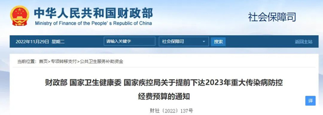 日前,國家財(cái)政部、國家衛(wèi)生健康委、國家疾控局三部門聯(lián)合發(fā)布了《財(cái)政部 國家衛(wèi)生健康委 國家疾控局關(guān)于提前下達(dá)2023年重大傳染病防控經(jīng)費(fèi)預(yù)算的通知》。此次提前下達(dá)的2023年重大傳染病防控經(jīng)費(fèi)共計(jì)156.4億元,相較于2022增長31%。